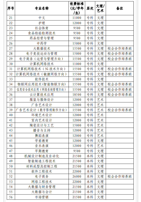 1、学费:学校各专业收费标准严格按对外公示的标准收取,其中本科文理类学费23500/年、艺术类28000/年、校企合作专业27000/年;专科文理类学费16000/年、艺术类18000/年、校企合作专业18500-19500/年。