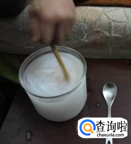 我们以勺子为计量单位,我们先取一勺洗衣粉和三勺水放入准备好的粘稠液中,这个浓度一定要调好,这一步最关键。