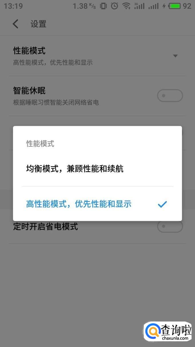 在设置界面中,将“性能模式”设置为高性能模式即可提升运行速度。