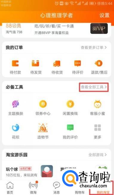 进入手机淘宝之后,我们点击右下角我的淘宝,然后我们点击查看全部工具;