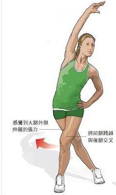 髂胫束伸展。拉伸部位:髂胫。双腿交叉,左腳跨过右腳,股部右顶,感到大腿紧绷。髂胫束是包裹大腿侧下方的带狀结蹄组织。伸展此处可以防止膝盖外侧疼痛(髂胫束综合症)。