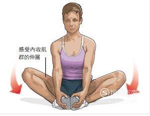 蝶式伸展。拉伸部位:腹股沟。坐姿,两脚掌相对,靠近身体。双膝慢慢向地面靠近,维持极限状态几秒。