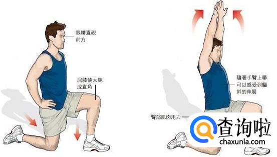 举臀弓步伸展。拉伸部位:全身。眼睛直视前方,单膝跪地,屈膝使大腿成直角,臀部肌肉用力,随着手臂上举,可以感受到躯干的伸展。
