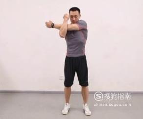 肱三头肌拉伸。站立,背、颈部伸直,也可以取坐位完成。右侧肩、肘关节屈曲,尽力触摸右肩胛骨。上臂尽可能地靠近耳朵, 肱骨的后面指向前方,而不要翻向外侧。这样可以最大限度地拉长肱三头肌。可以用左手抓住右侧肘部,为右侧肱三头肌等长收缩提供阻力,保持颈部竖直,持续等长收缩6秒钟后,正常呼吸。等长收缩后,放松,深呼吸。呼气时,手触摸背部下方更远处,进一步拉长肱三头肌。