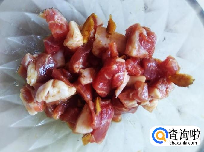猪肉也切成小丁,加适量的盐、姜蓉、生抽、料酒腌制几分钟。