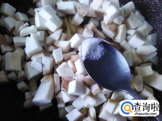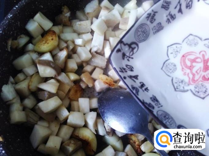 再放杏鲍菇进去,加适量的盐、洒点水花。