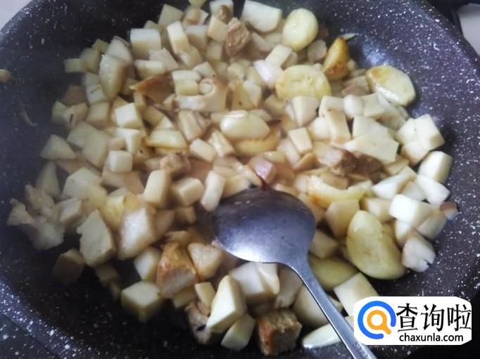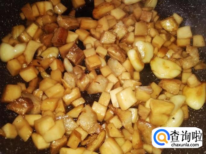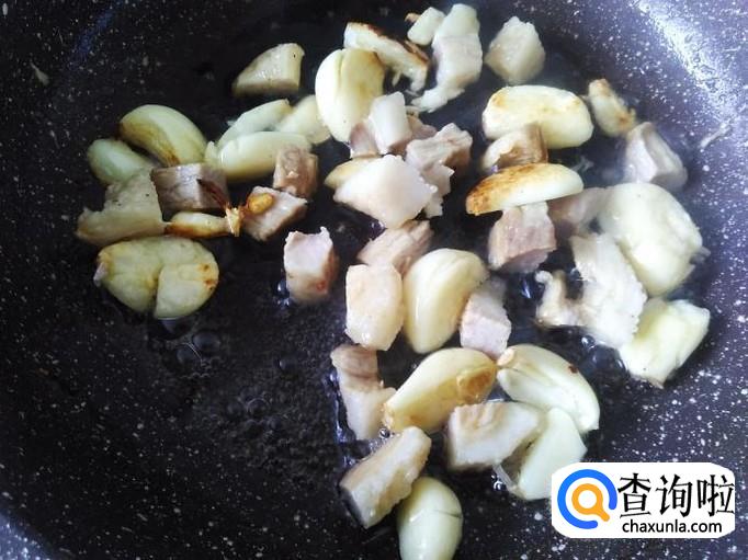 开火下油,放蒜米进去爆香,然后放肉丁进去翻炒至变色。