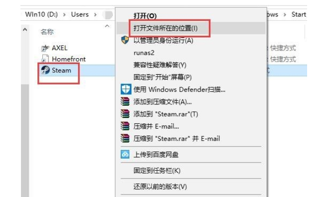 1、右键Steam快捷方式,选择“打开文件夹所在位置”。