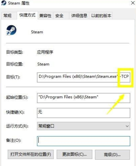 2、切换至快捷方式,目标栏添加 -tcp,注意-tcp前方有个空格。点击确定即可。