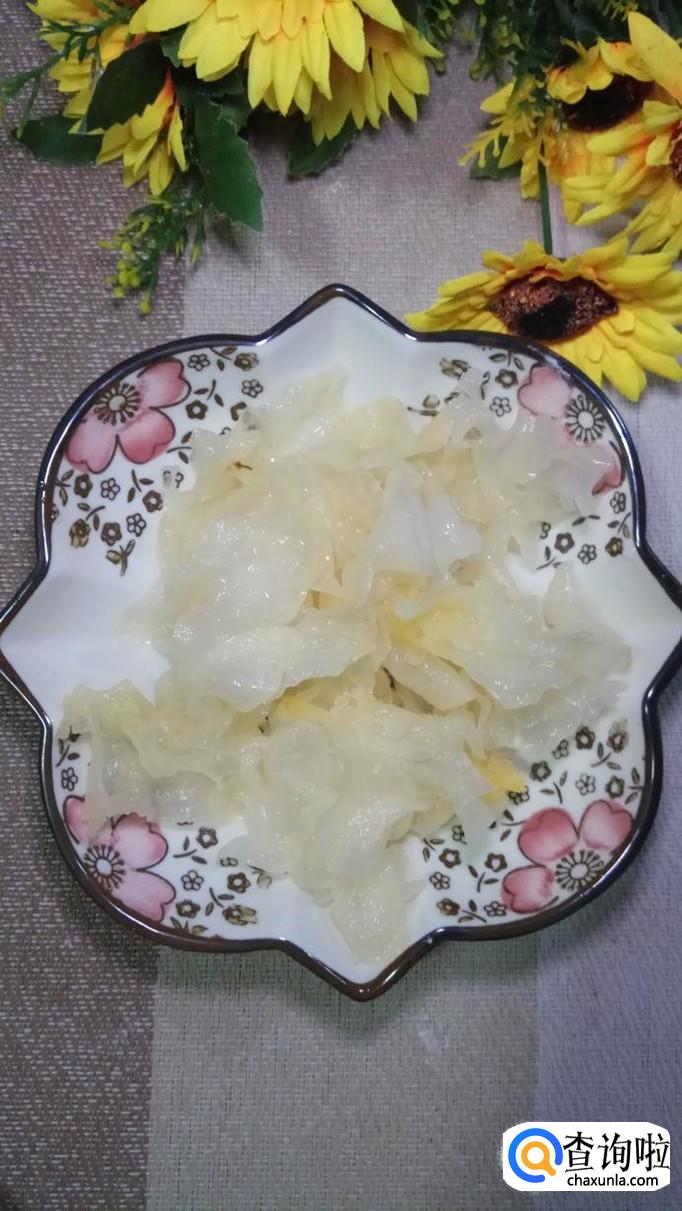 准备适量银耳和黑木耳,用水泡发,在冷水中,加入少许白醋,很快就泡发了。