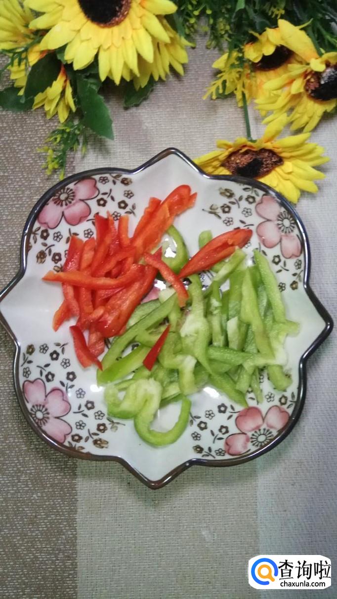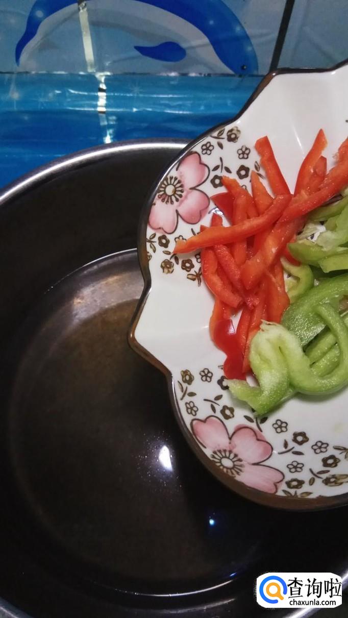 再准备适量青红椒,将青红椒洗净后切成丝,倒入锅中焯水,这里选用的青红椒是菜椒,所以焯水后更好吃。
