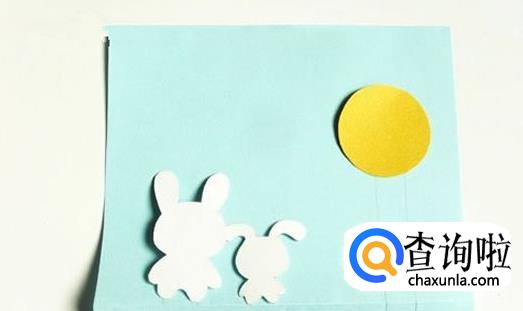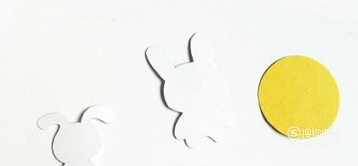 从白色卡纸上剪出一大一小两只兔子,再从黄色卡纸上剪出圆月亮。