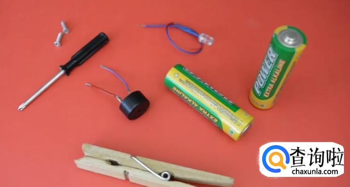 首先准备一个夹子,两节电池,蜂鸣器,IED灯,两颗螺丝,一把起子。