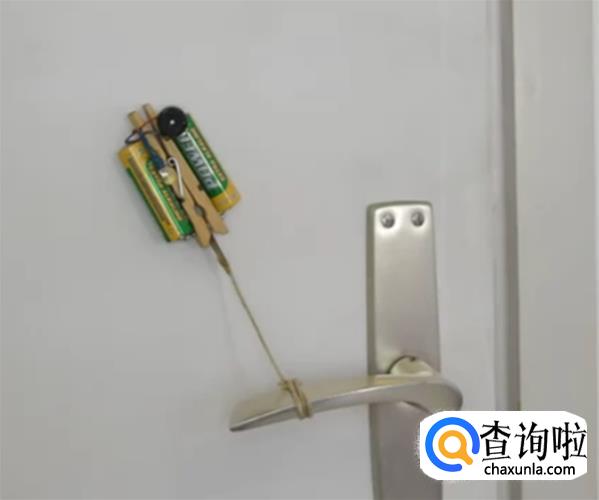 将整个报警器固定在门上,小纸片夹在螺丝中间起到绝缘作用。当有人开门的时候旋转门把手,就会拉动绳索,纸片脱落,电路接通,蜂鸣器响起。