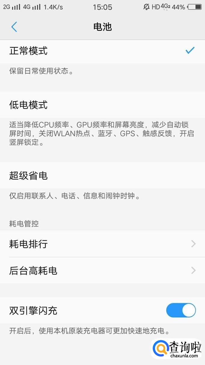 进入“电池”选项后,向下滑动即可看到双引擎闪充,将其打开即可开启快充,如图所示。
