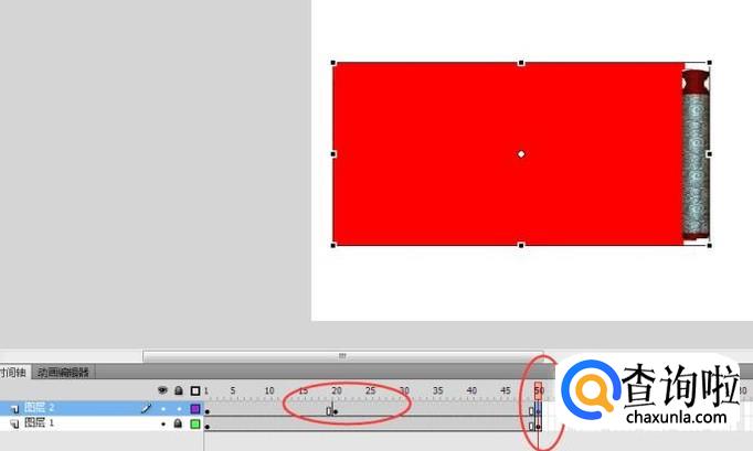 在图层1中的第50帧位置插入关键帧,在图层2第20和50帧位置插入关键帧,并拖动长方形,如下图所示: