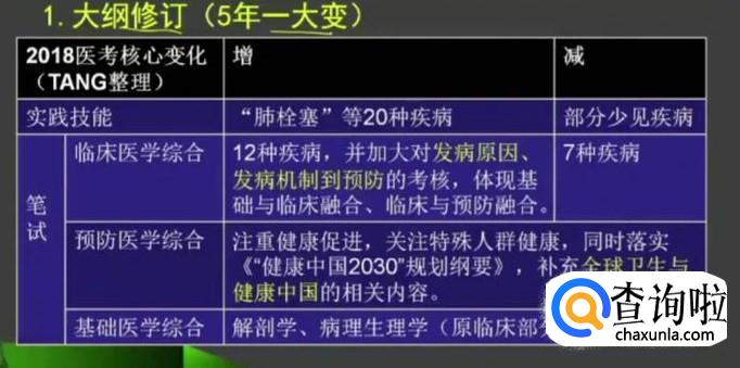 5年一变的大纲修订,实践技能部分,增加了20多种疾病,减少了部分少见疾病;笔试部分在临床医学综合加大了对疾病发病病因、发病机制和疾病预防的考试,减少了7种疾病;在笔试预防医学综合方面补充了全球卫生与健康中国的相关内容;把解刨学和病理生理学调整到了基础医学综合。