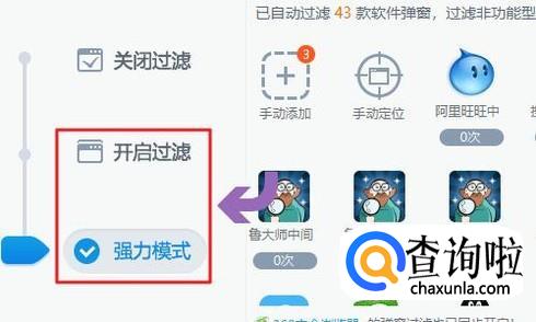 点击之后在弹窗过滤器对话框的左侧,我们将模式设置为开启过滤或者强力模式,这样系统就会自动过滤电脑里有广告弹窗的软件;