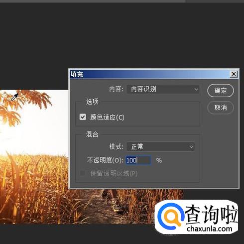 调出填充对话框,设置内容为:内容识别;再点确定。