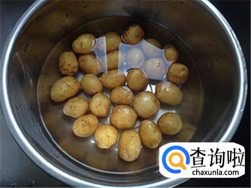 蒸土豆最好是选用刚刚刨出来的新鲜的小土豆,那样的土豆蒸着吃才叫好吃呢。小土豆浸泡在水里清洗干净。
