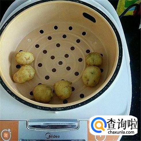蒸锅里面加上清水,放上蒸格,把小土豆依次放进去盖上锅盖。