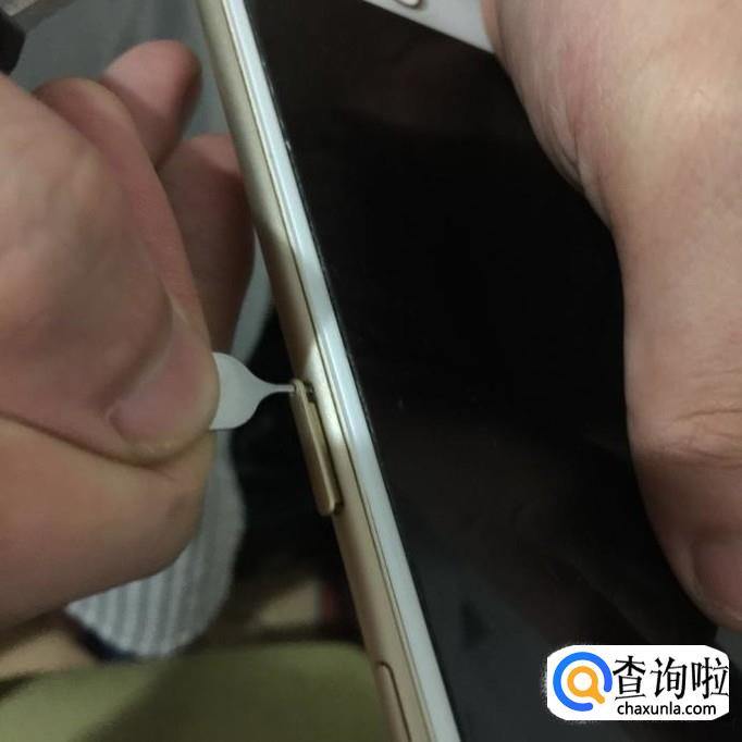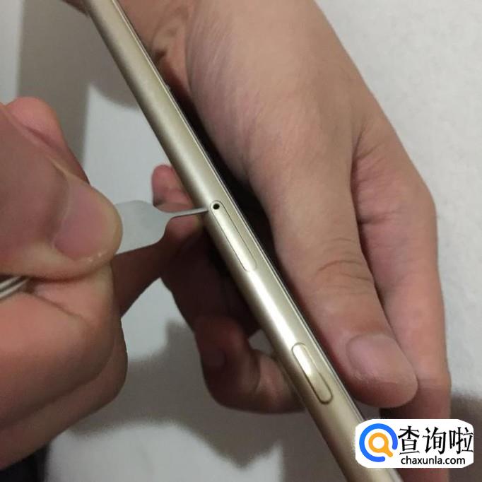 然后用卡槽针对着苹果手机侧边的小孔插进去,轻轻挤压,苹果手机的卡槽就弹出来了。