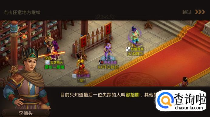 打开游戏后,去到天墉城衙门处领取任务,这时候李捕头会告诉你,目前只知道最后一位失踪的人叫容拙脚,其他线索都断了。