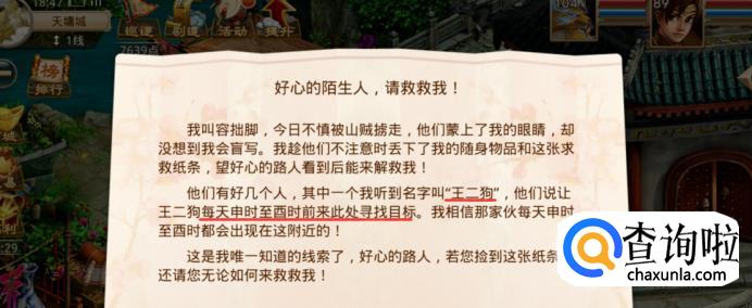 打开靴子之后会得到一封书信,上面有容拙脚的求救信息,她告诉我们每天下午的3点到7点这个时间段,王二狗会到此处巡逻,所以我们必须要在这个时间段找他。