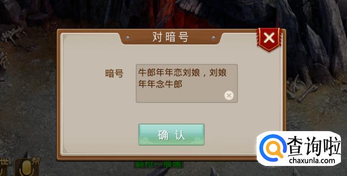 赢得胜利后,再次点击王二狗进入巢穴,这时会有一个弹窗要求输入暗号,暗号是“牛郎年年恋刘娘,刘娘年年念牛郎”,注意,最后结尾没有句号。