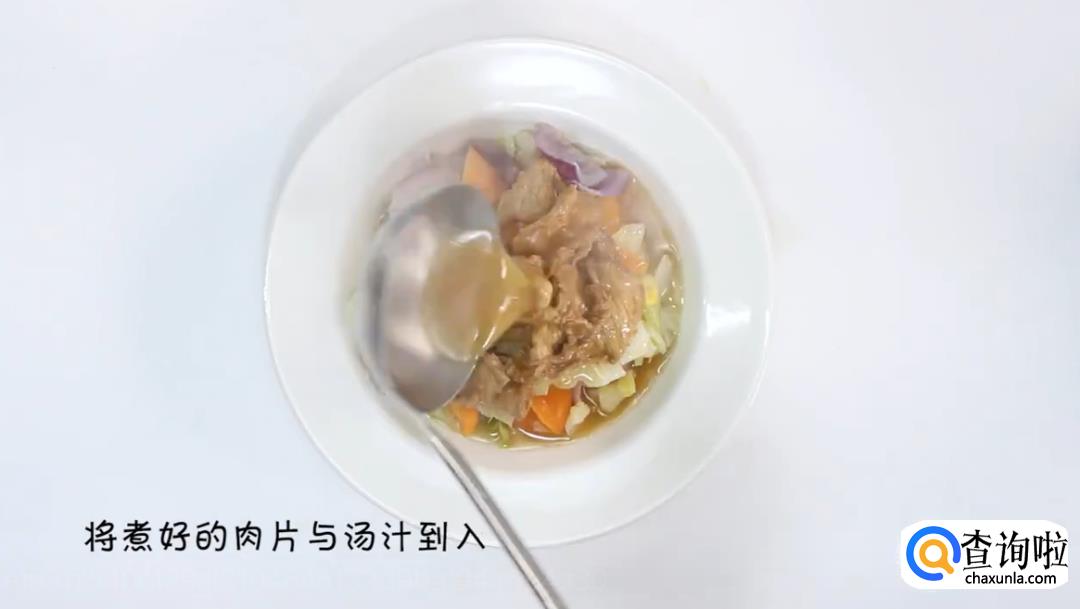 最后,将煮好的肉片和煮肉的汤汁倒入装蔬菜的碗中,再撒上一些葱花,这道嫩滑肉片羹就完成了。