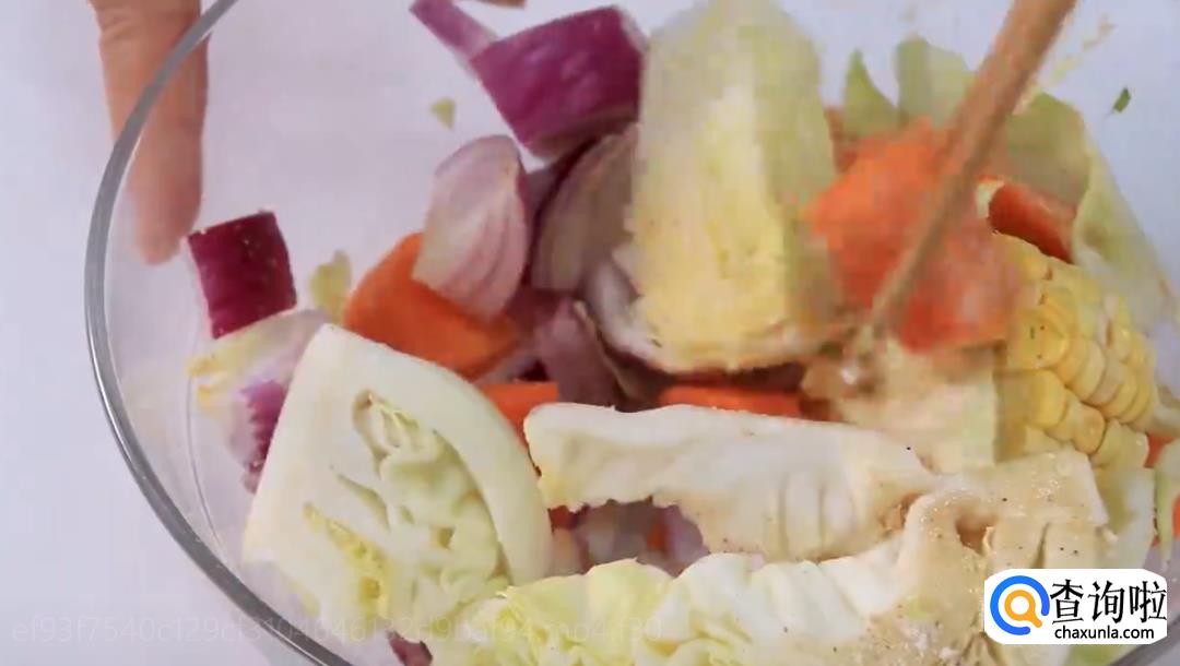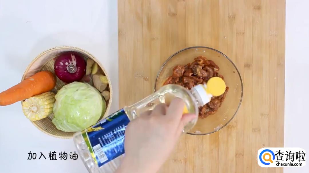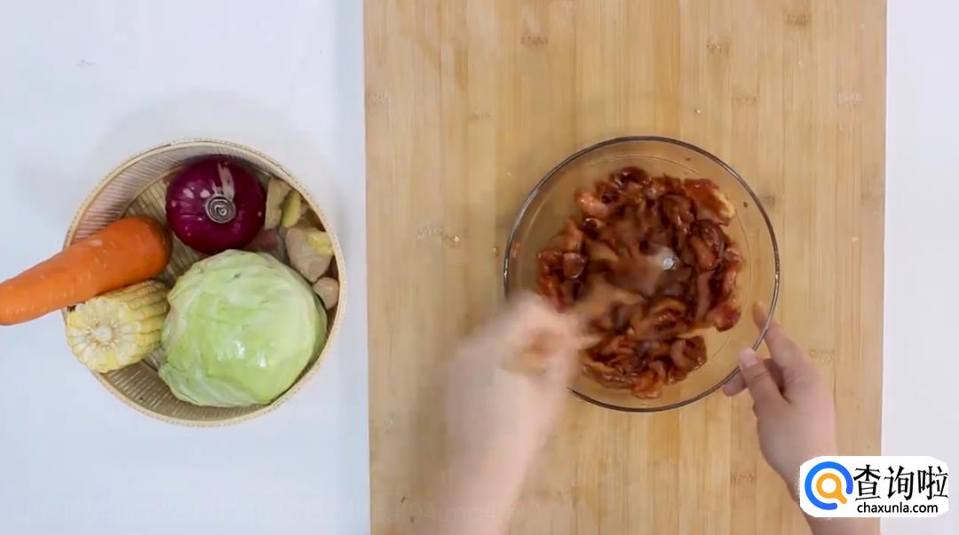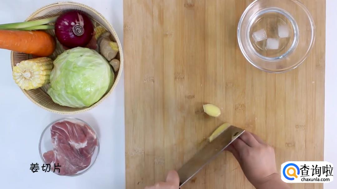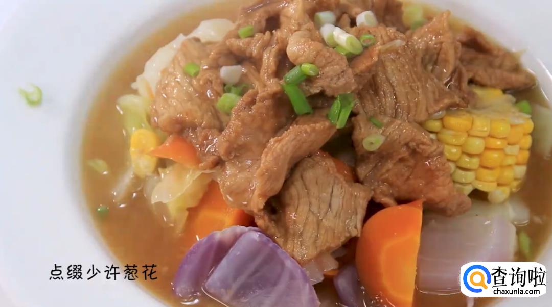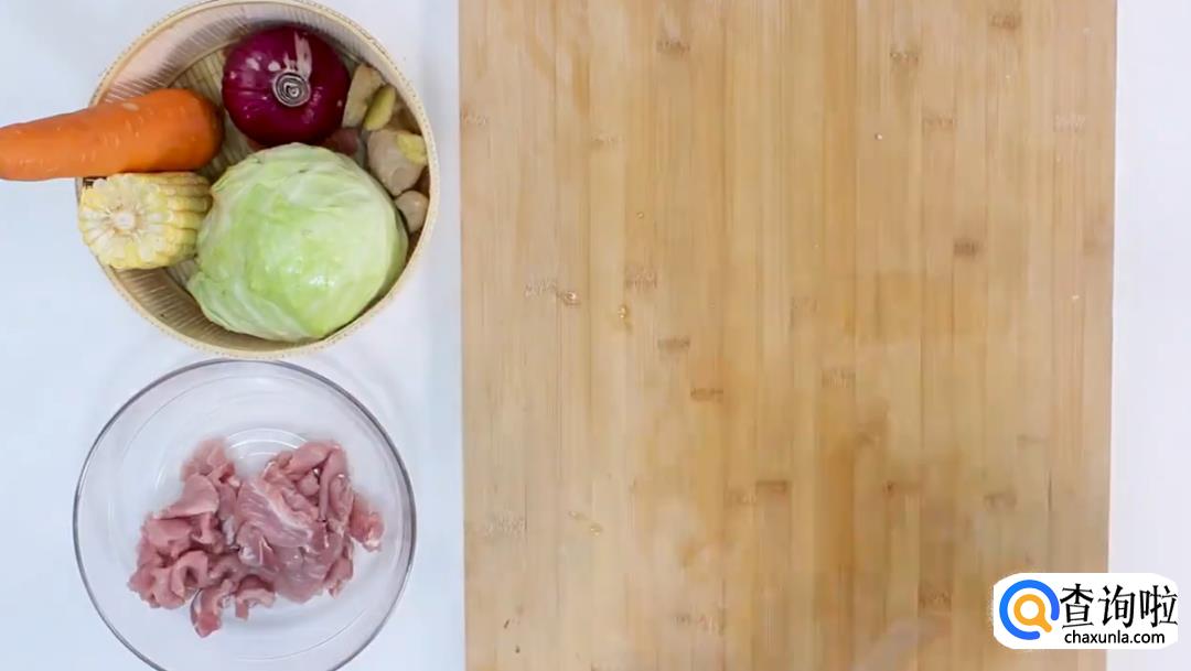 梅条肉、玉米、胡萝卜、包菜、葱、姜、洋葱、胡椒粉、香油、鸡粉、盐、糖、老抽适量
