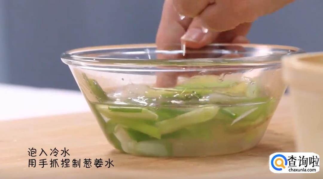 将切好的姜片和葱段一起放入容器中,加入冷水,用手抓捏混合,制作成葱姜水。