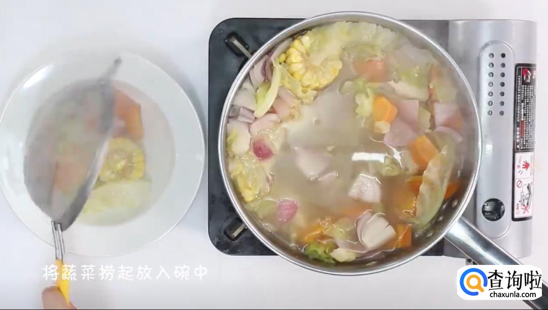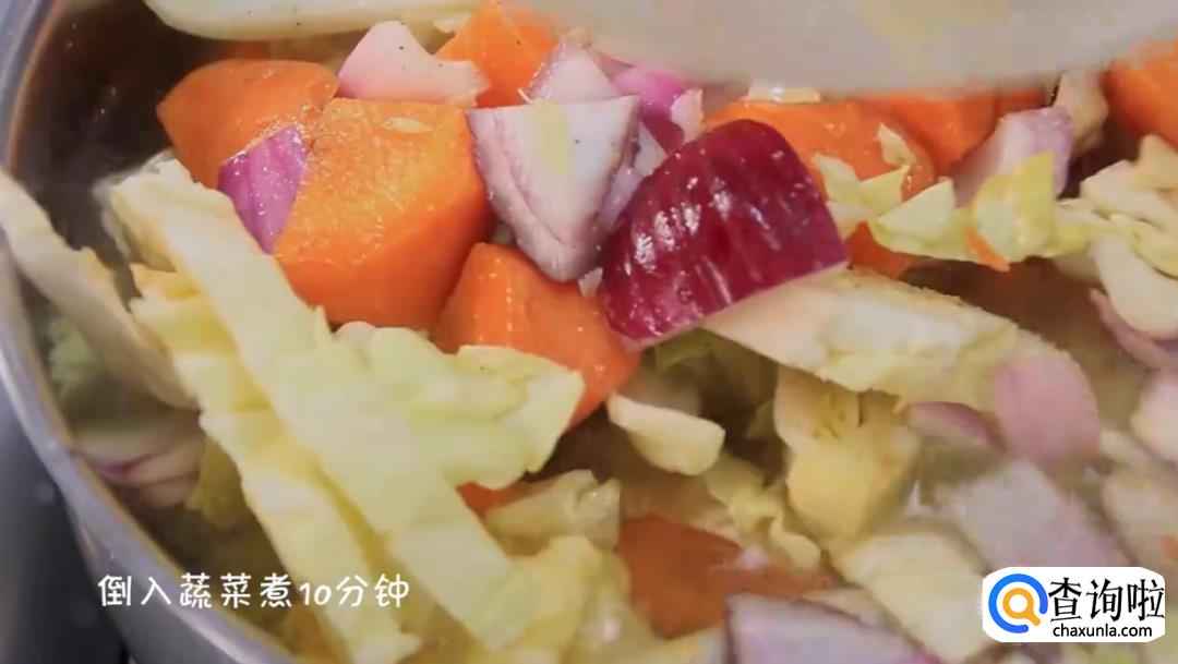继续往锅里倒入刚才准备好的蔬菜,煮10分钟。到时间后,将蔬菜捞起来放进碗中。