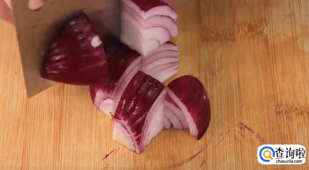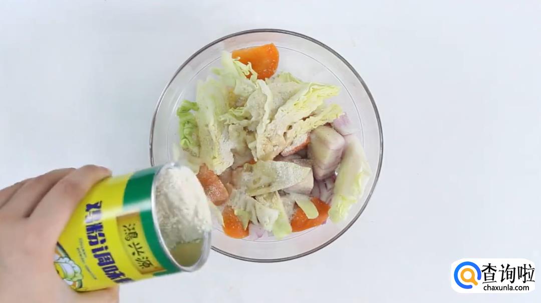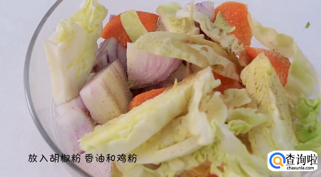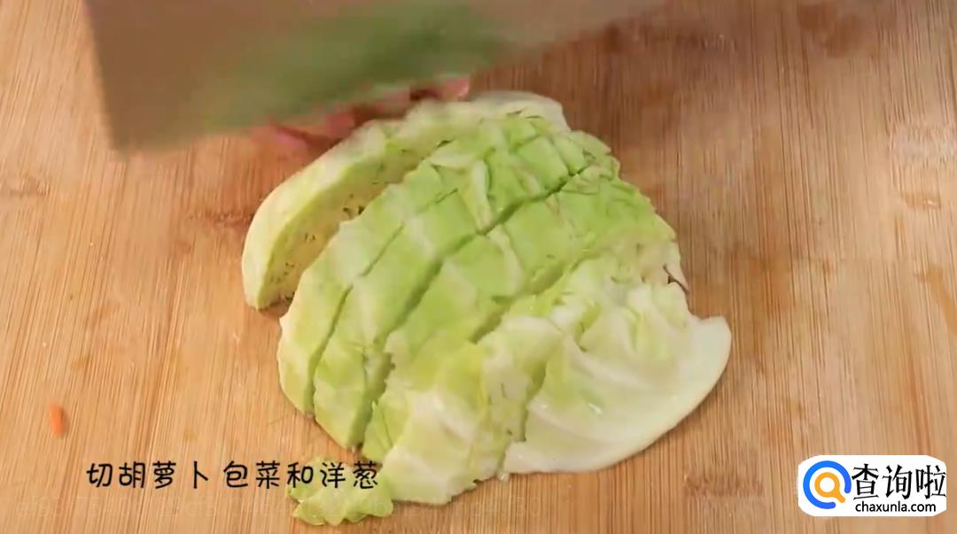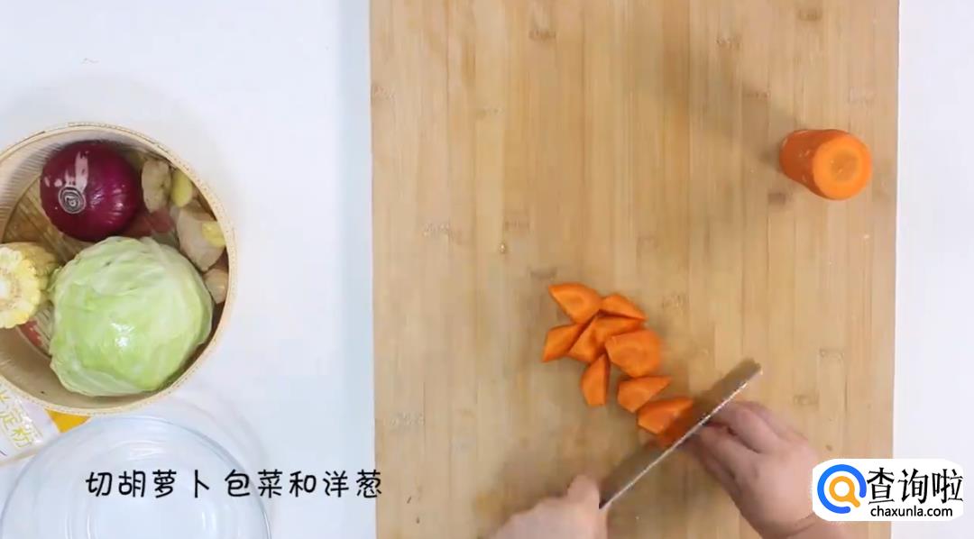 下一步,将备好的胡萝卜、包菜和洋葱进行切块,装在一个碗里。