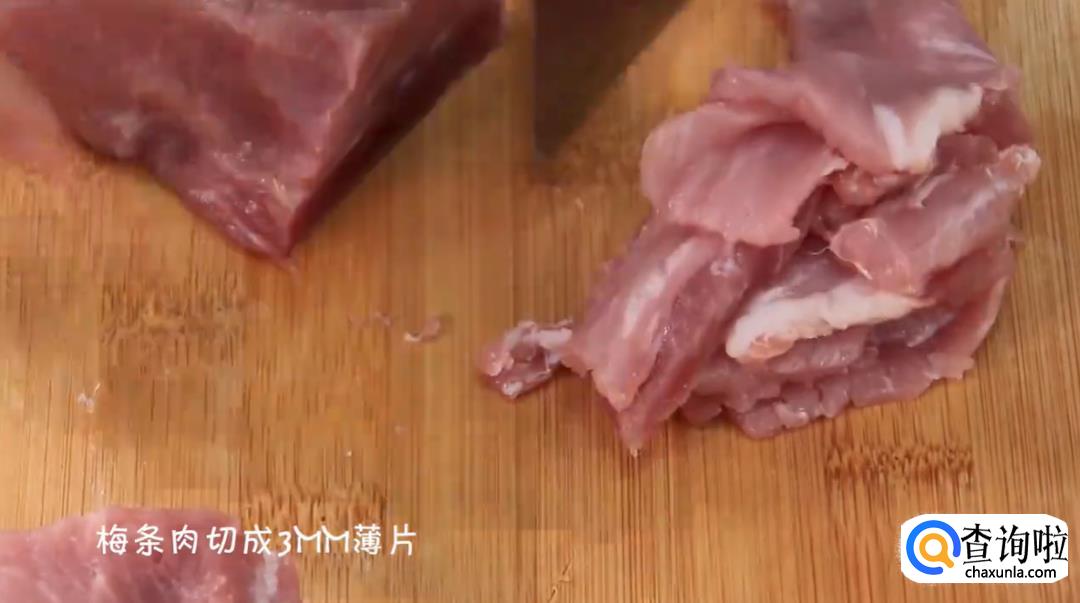 接下来,把准备好的梅条肉切成3毫米左右的薄片,切好后呈入碗中备用。