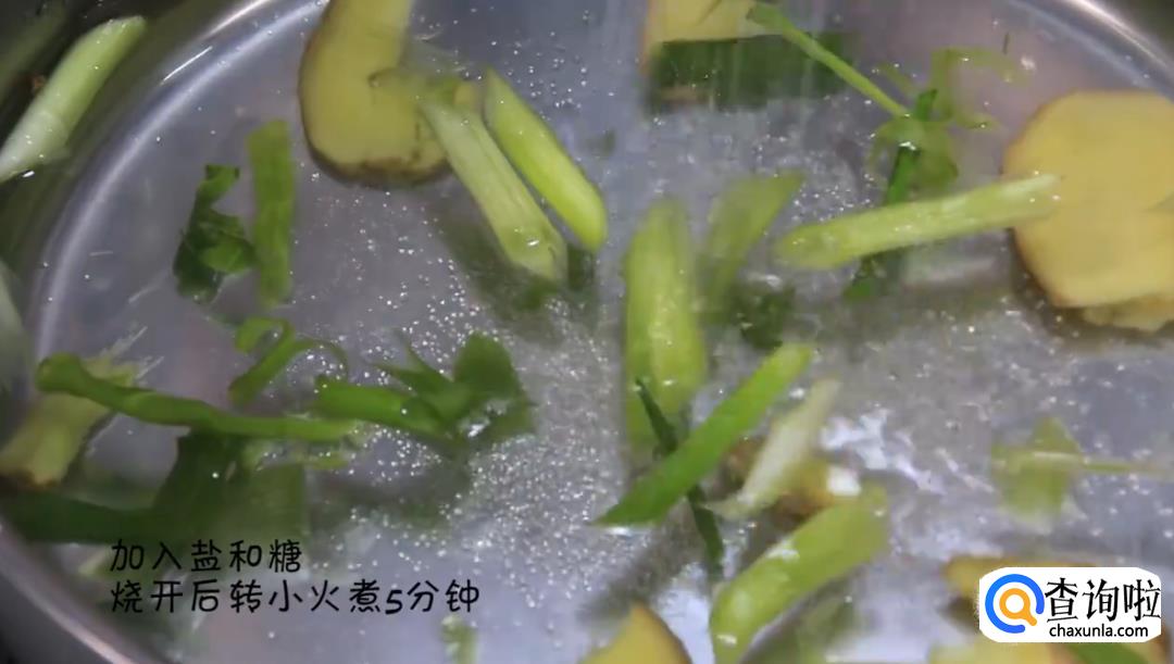 在锅里倒入剩余的葱姜水,再加入盐和糖,大火烧开后转小火煮5分钟,然后将锅里的葱和姜捞出来。