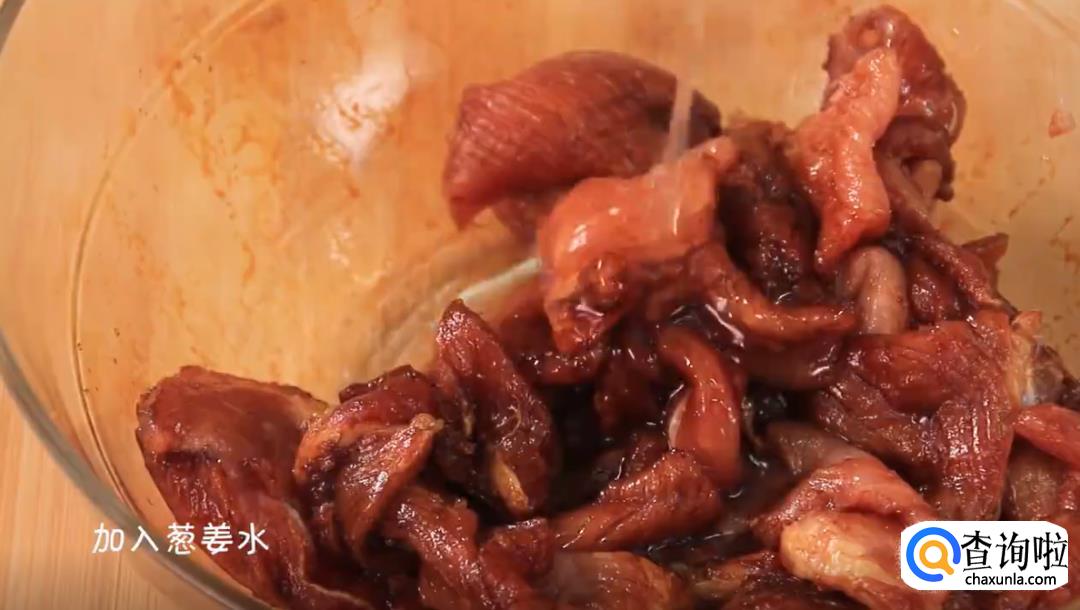 将刚才制作好的葱姜水倒入肉片碗中,量不用太多,然后再搅拌均匀。