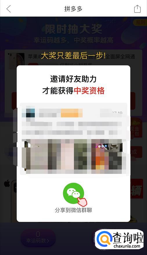 回到拼多多,点击分享,选择好友聊天框即可将奖品信息分享给好友,好友点击分享信息即可参与活动;