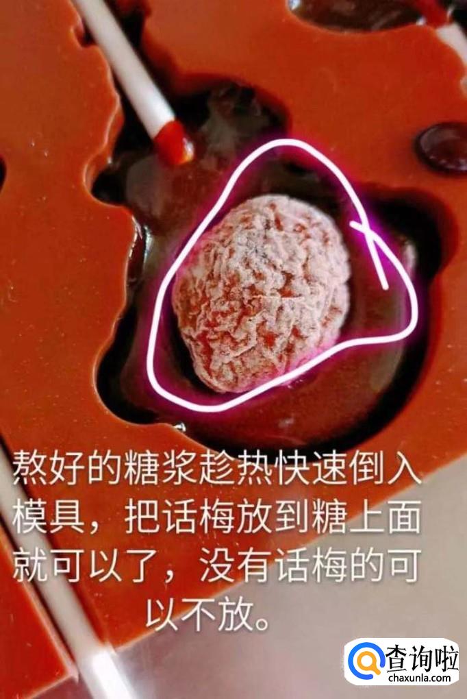 糖浆熬好后,速度倒入模具中并在表面压上话梅,如下图所示。小贴士:如果大家喜欢吃其他的口味的干果也是可以放的。