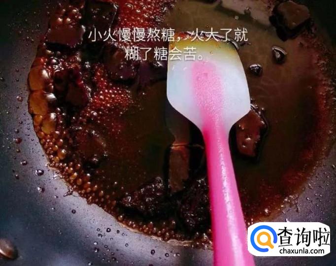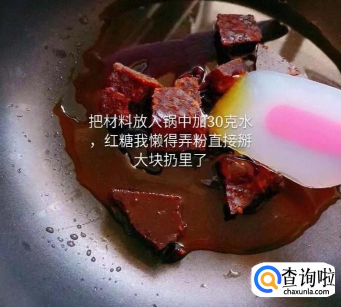 接着把材料放入锅中,加入30克的水,如下图所示。小贴士:如果大家不嫌麻烦,可以把红糖磨成粉末,再放入锅中,这样效果会更好一点。