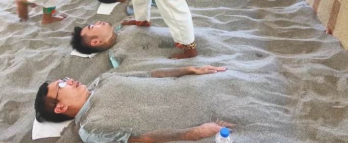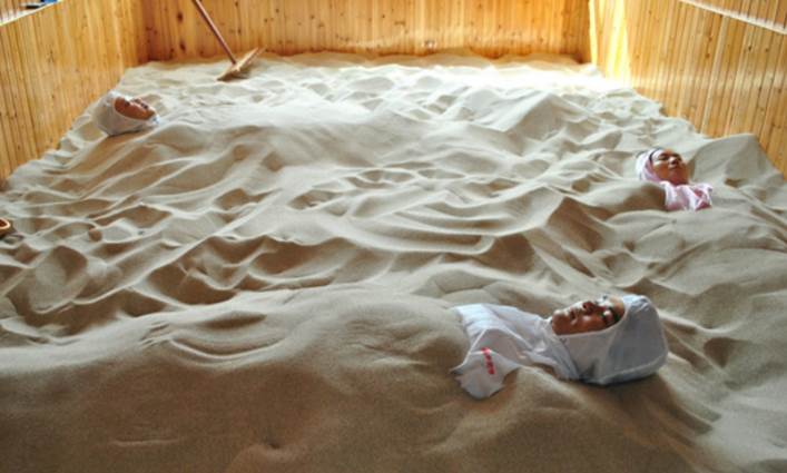 沙浴分为室内沙浴和室外沙浴,相较于泥浆浴而言,更容易加强人体的汗腺分泌,有利于加速水肿的消散,促使新陈代谢,具有一定的消炎作用。此外,沙浴还具有防止人体内淋巴液和血液渗出、促进渗出液吸收等作用。