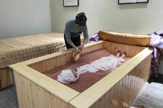 我国古代的医学著作《千金要方》和《本草拾遗》中都有对沙浴疗法比较详尽的描述。比如陈藏器在其所著的《本草拾遗》就有这样的一段记载:“六月河中诸热沙,主风温顽痹不仁,筋骨挛缩,风掣瘫痪,血脉断绝。取干沙日暴令极热,伏坐其中,冷则更易之。”沙浴后,人体全身气血运行加快,有利于保持经络通畅,进而攻邪外出,对于寒湿性疾病的治疗效果尤为明显。