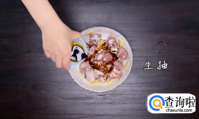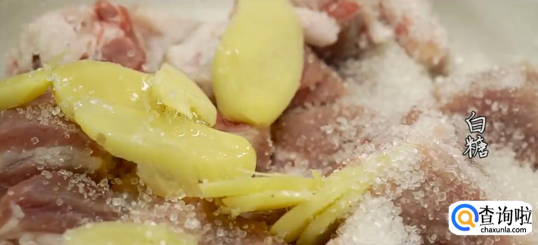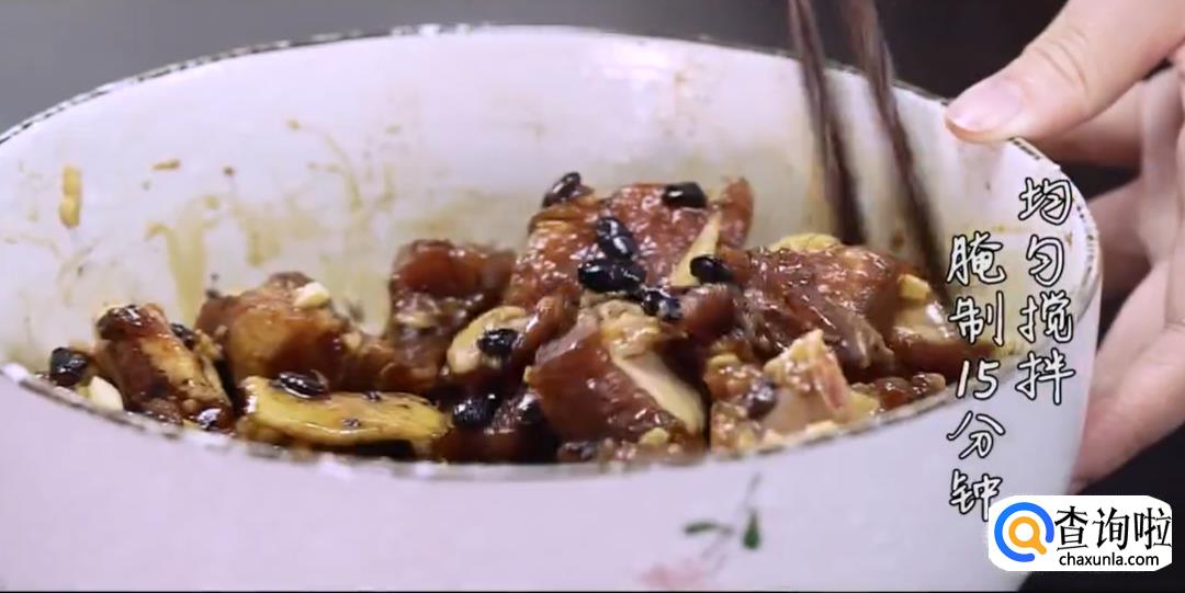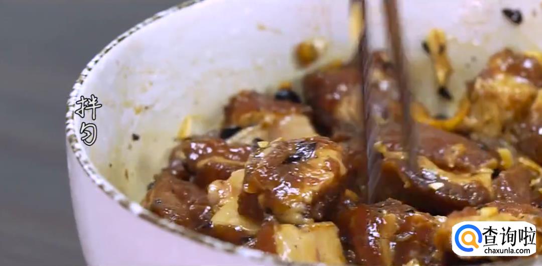 在排骨中加入姜片、花生油、白糖、蒜末、盐、料酒、生抽、老抽、豆豉,搅拌均匀后腌制15分钟。