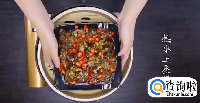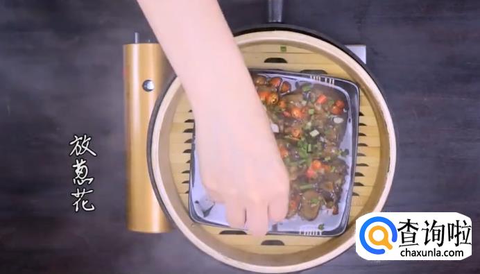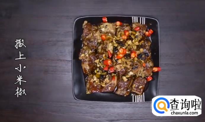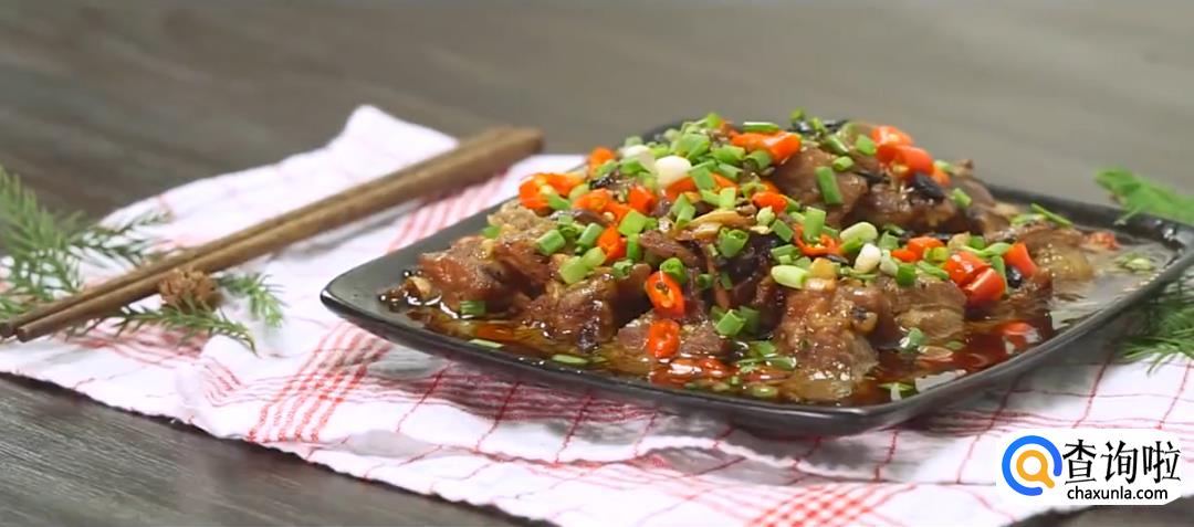加入水淀粉拌匀后装盘,撒上小米椒;热水上蒸锅,用中火蒸25分钟;蒸好后撒上葱末,这样一道热气腾腾的豉汁蒸排骨就做好了。