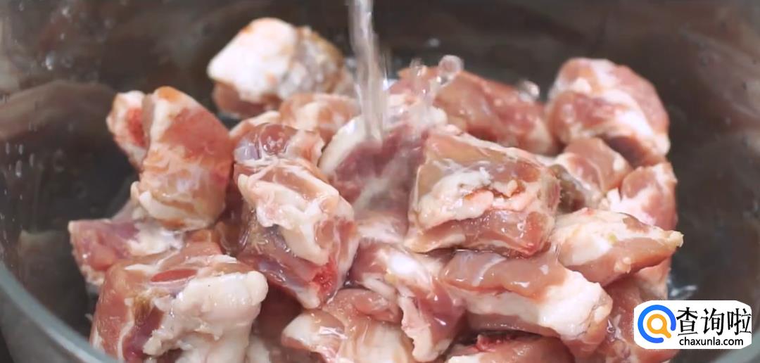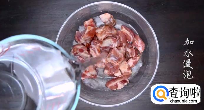 将排骨切小块后盛入碗中,加水浸泡,静置半小时,去除血水。