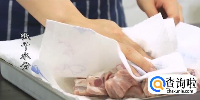 将排骨从水中捞出放入盘中,用厨房用纸按压一下,吸干水分后放入碗中。
