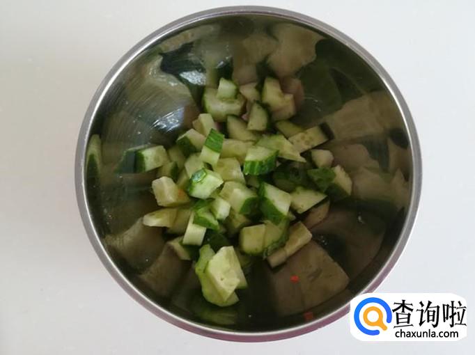 把黄瓜洗净,也切成小丁放碗里,香菇去蒂洗净也切成小丁。