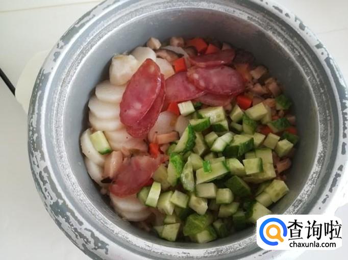 把电饭煲的内胆清洗干净,把洗好的薏米倒入内蛋里,再把准备好的腊肠,山药,黄瓜,香菇全部放入电饭煲内胆里的薏米上。