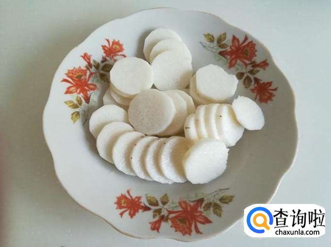 把山药去皮洗净切成薄片放盘里,给山药去皮一定要带上手套,不然皮肤会发痒的,很难受的。