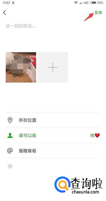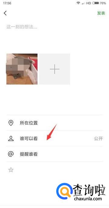 接着我们把需要发表的朋友圈写下来,下面可以选择谁可以看,点击一下。